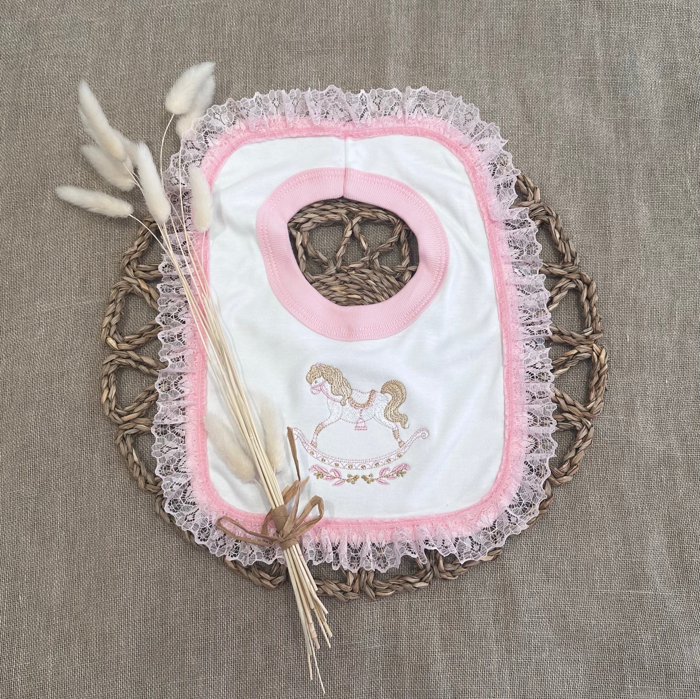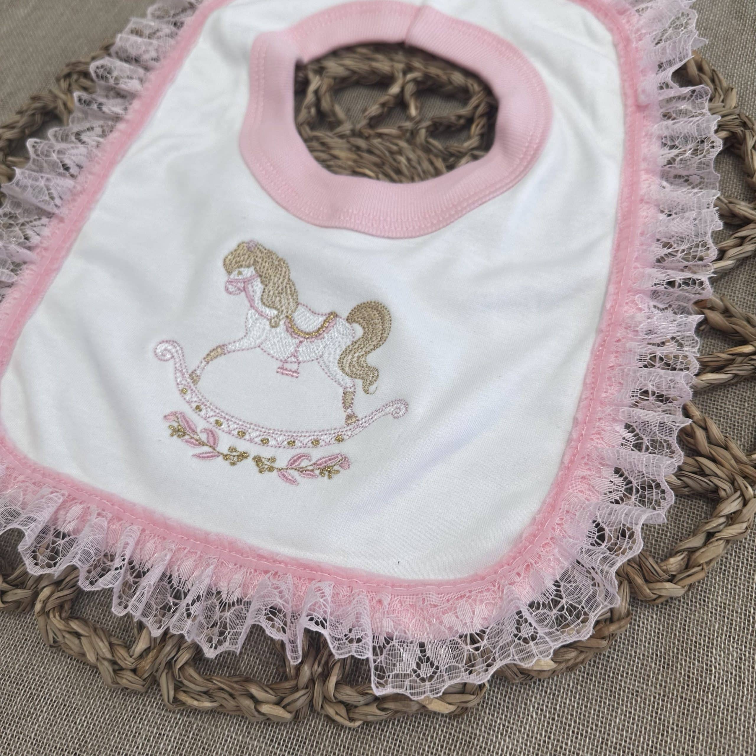 Baby girls Embroidered Rocking Horse bib with a beautiful lace trim.