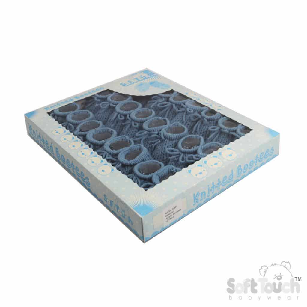 Baby Dusky Blue knitted booties from Soft Touch. The perfect gift for the new baby in your life. Also available in grey, white, and pink.