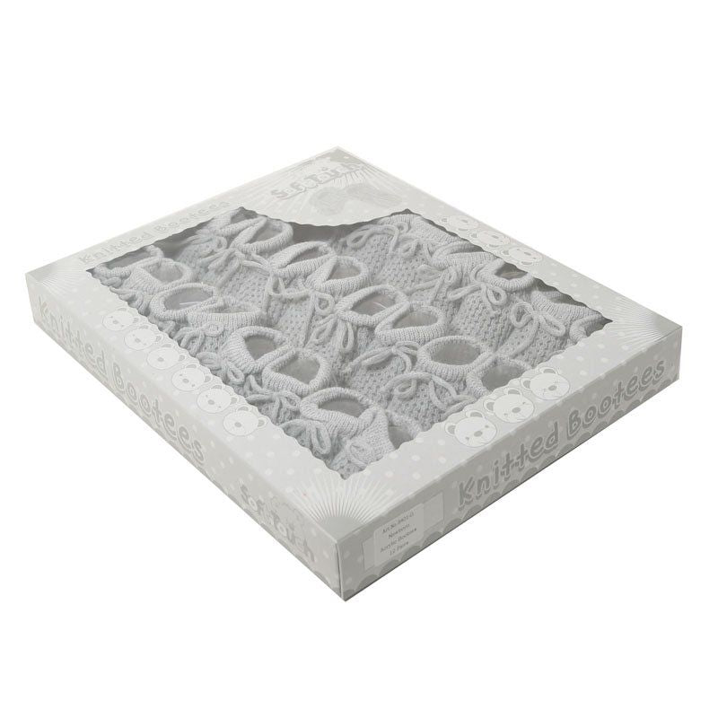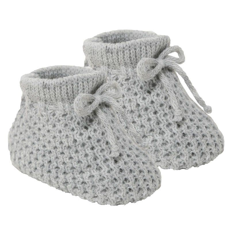 Baby Grey knitted booties from Soft Touch. The perfect gift for the new baby in your life. Also available in grey, white, and pink.