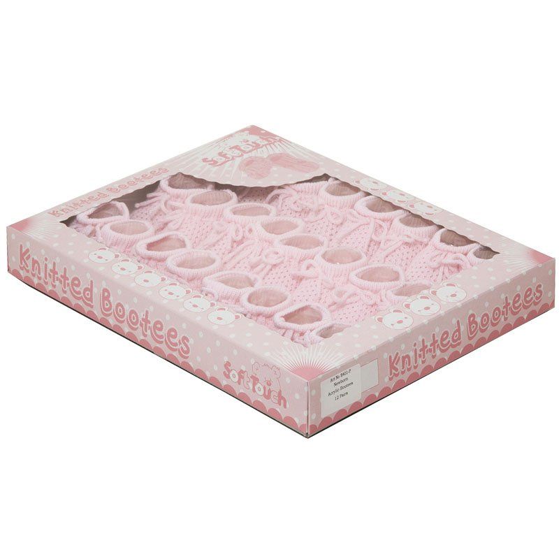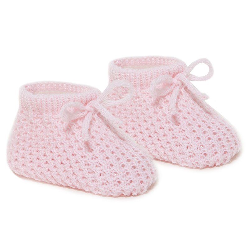Baby Pink knitted booties from Soft Touch. The perfect gift for the new baby in your life. Also available in grey, white, and pink.