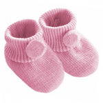 Baby Pink knitted pom pom booties from Soft Touch. The perfect gift for the new baby in your life. Also available in grey, white, and pink.