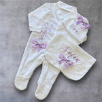 Girls beautiful personalised sleepsuit set with match beanie hat and bib.
