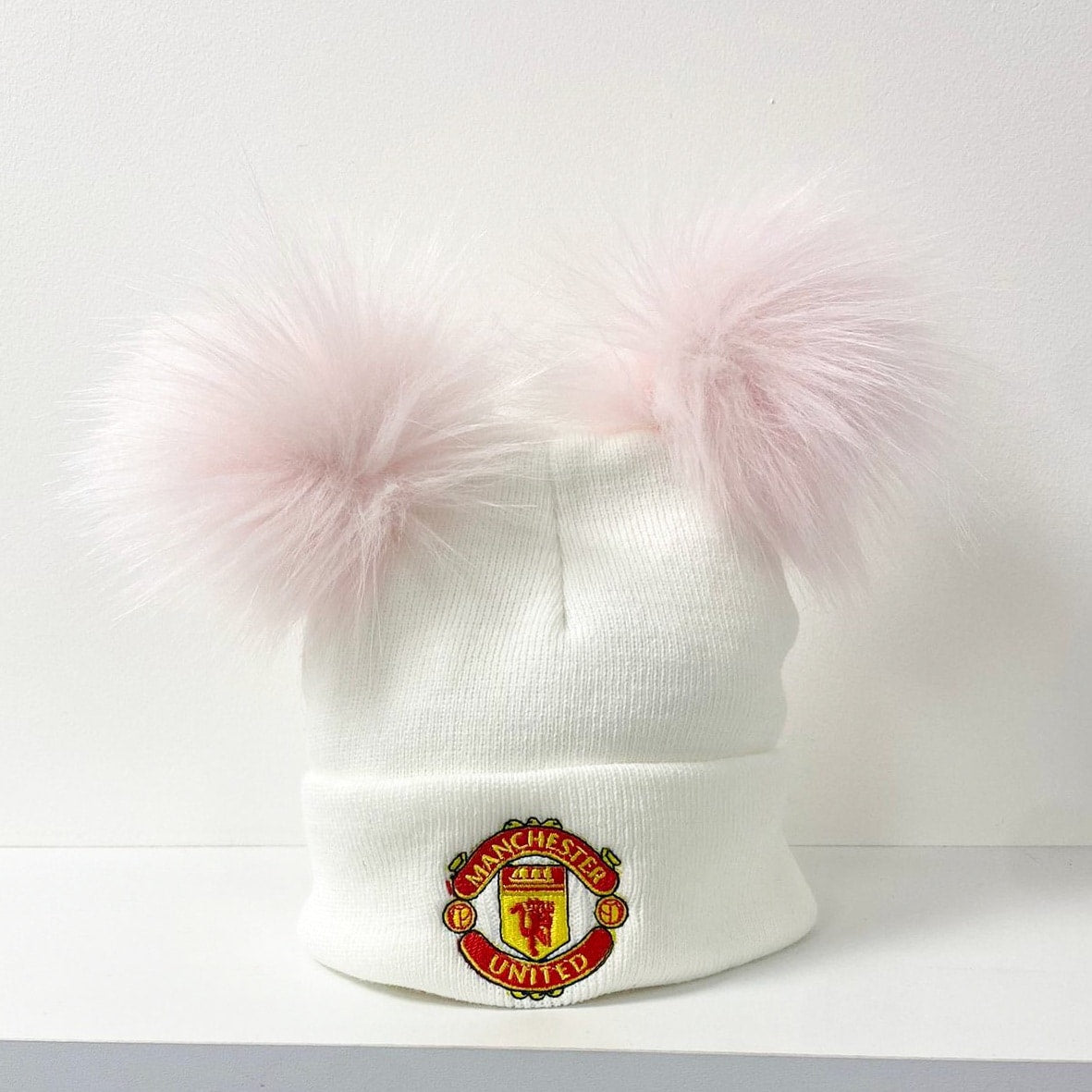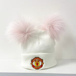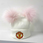 A beautiful white pom hat featuring 2 pink pom pom embroidered with the Manchester United Football emblem.