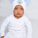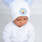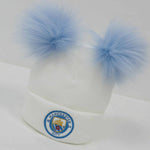 A beautiful white pom hat featuring two blue pom poms, embroidered with the Manchester City Football emblem.