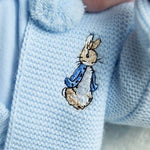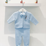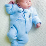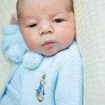 Baby boys Knitted Jacket with pom poms on the front and Peter rabbit & Trousers with full foot, perfect for a coming home outfit, Gift for a baby shower. Team it up with a babidu vest under neath.
