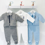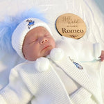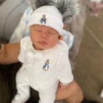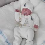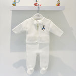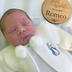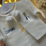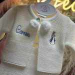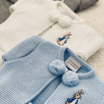 Beautiful Spanish Knitted Outfit with a Peter Rabbit Embroidery on perfect for a coming home outfit, this is one of our best sellers. check out the matching peter rabbit hat. If you choose for it to be personalised the name will be on the opposite side of peter rabbit.