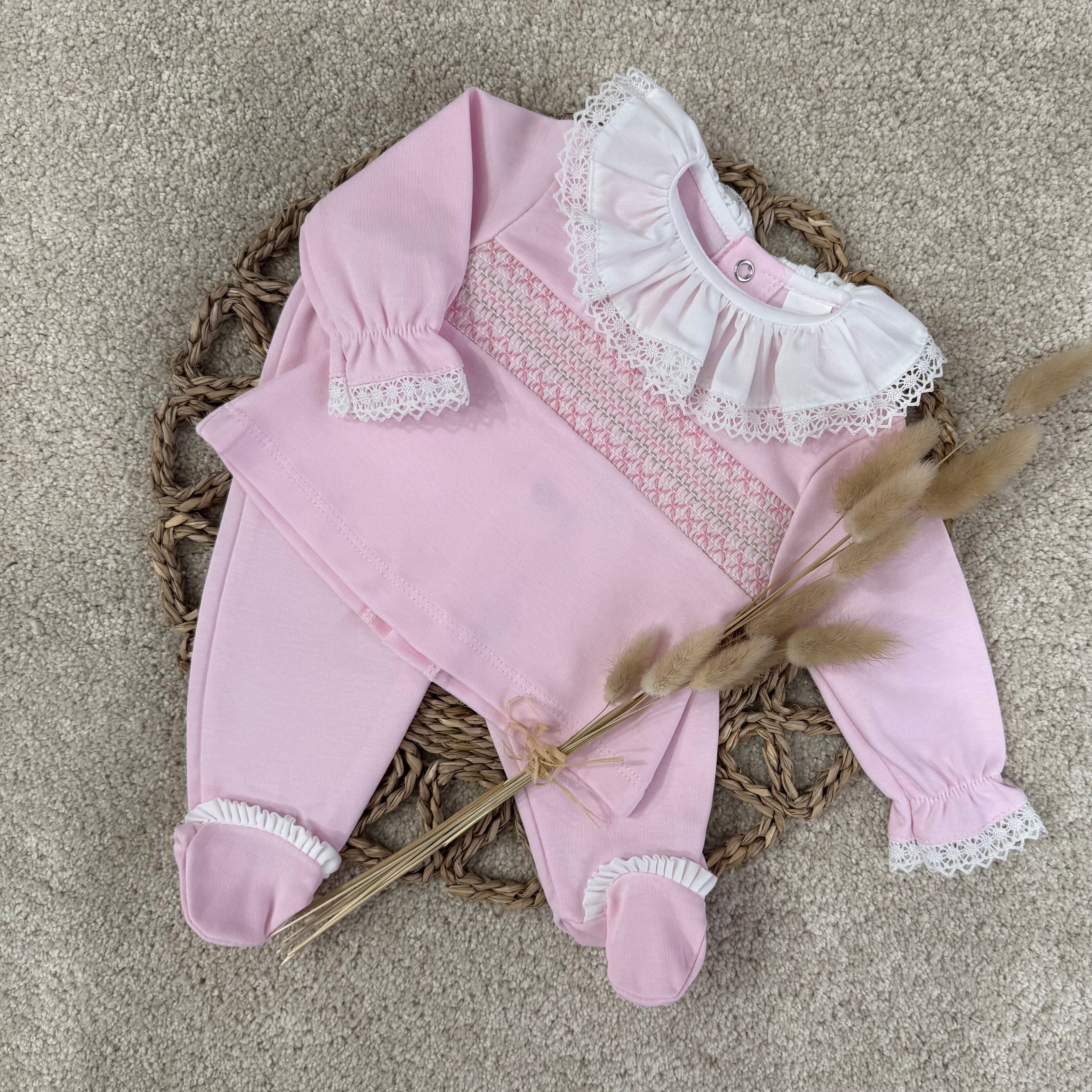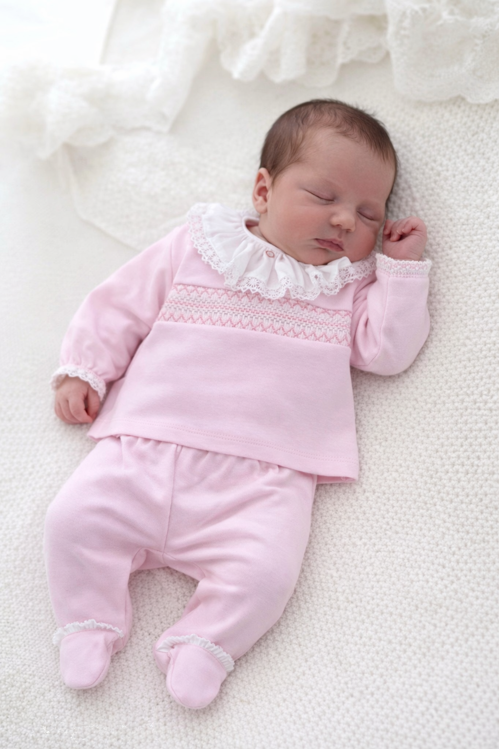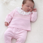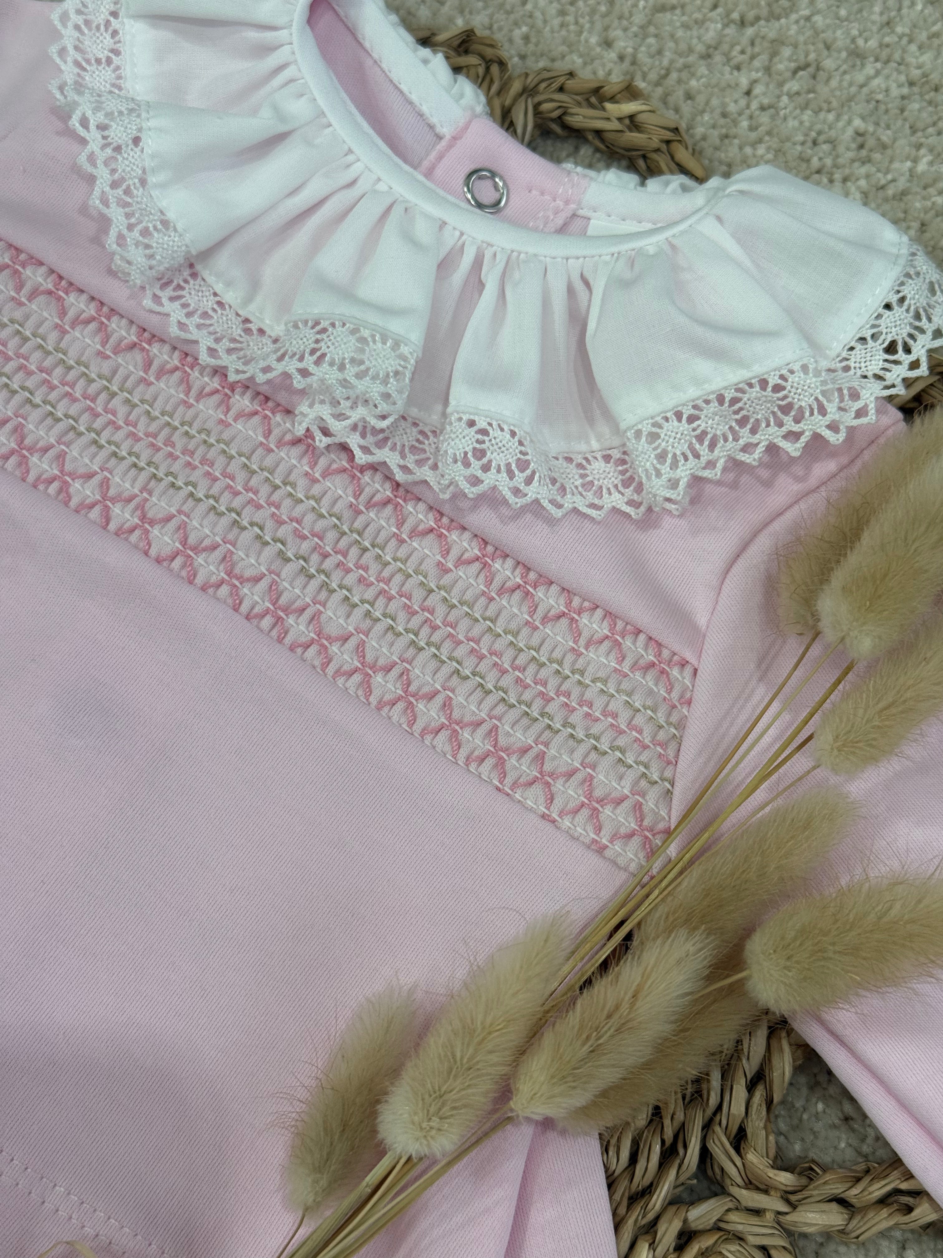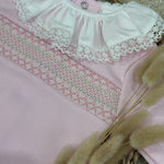 Dress your little one in timeless elegance with our White & Pink Smocked Baby Girl Two Piece Set. Designed with delicate traditional details, this beautiful outfit features a classic hand-smocked panel across the chest, finished with soft pink embroidery and a stunning frill collar trimmed with matching lace.