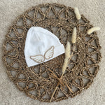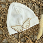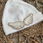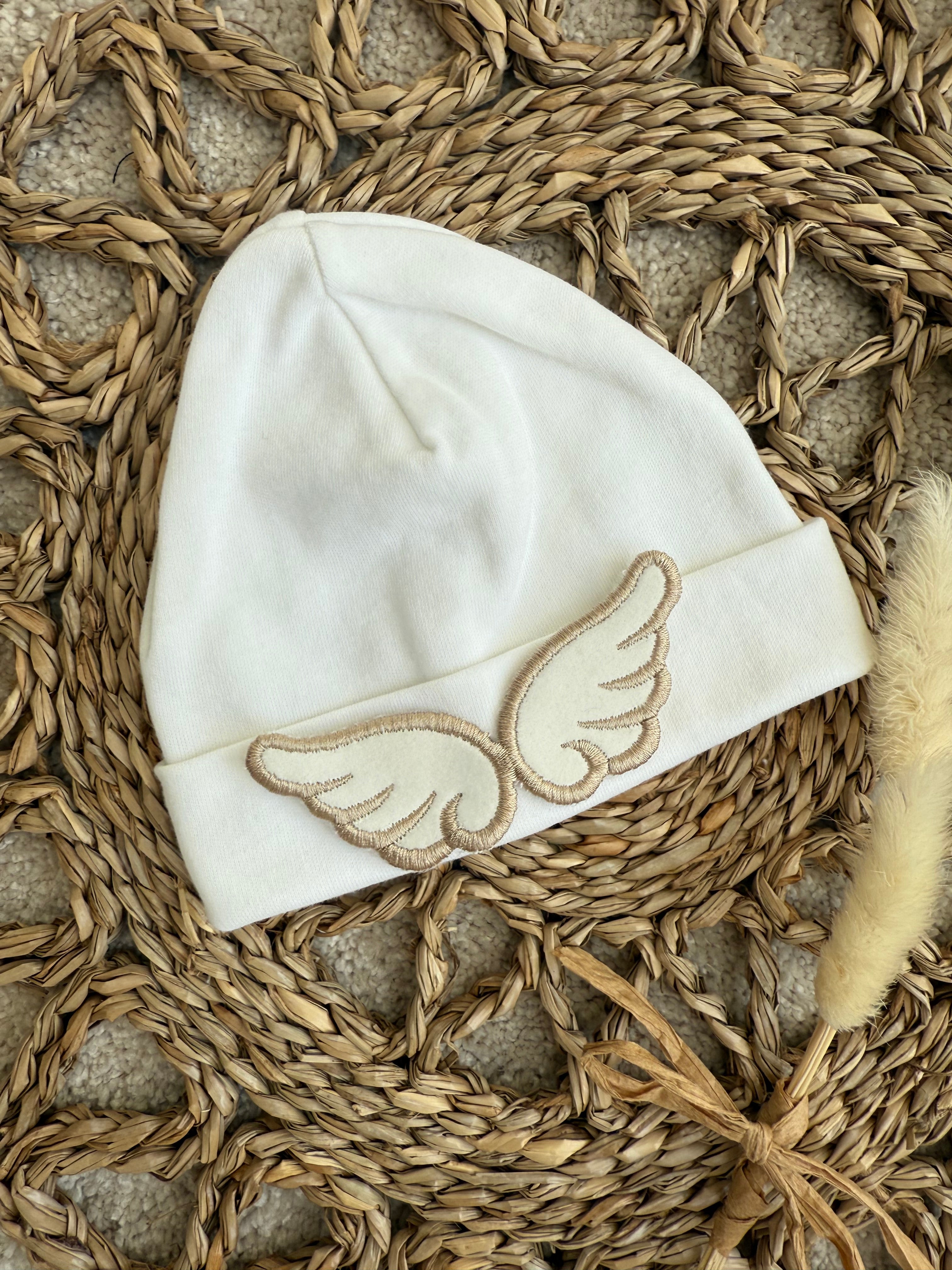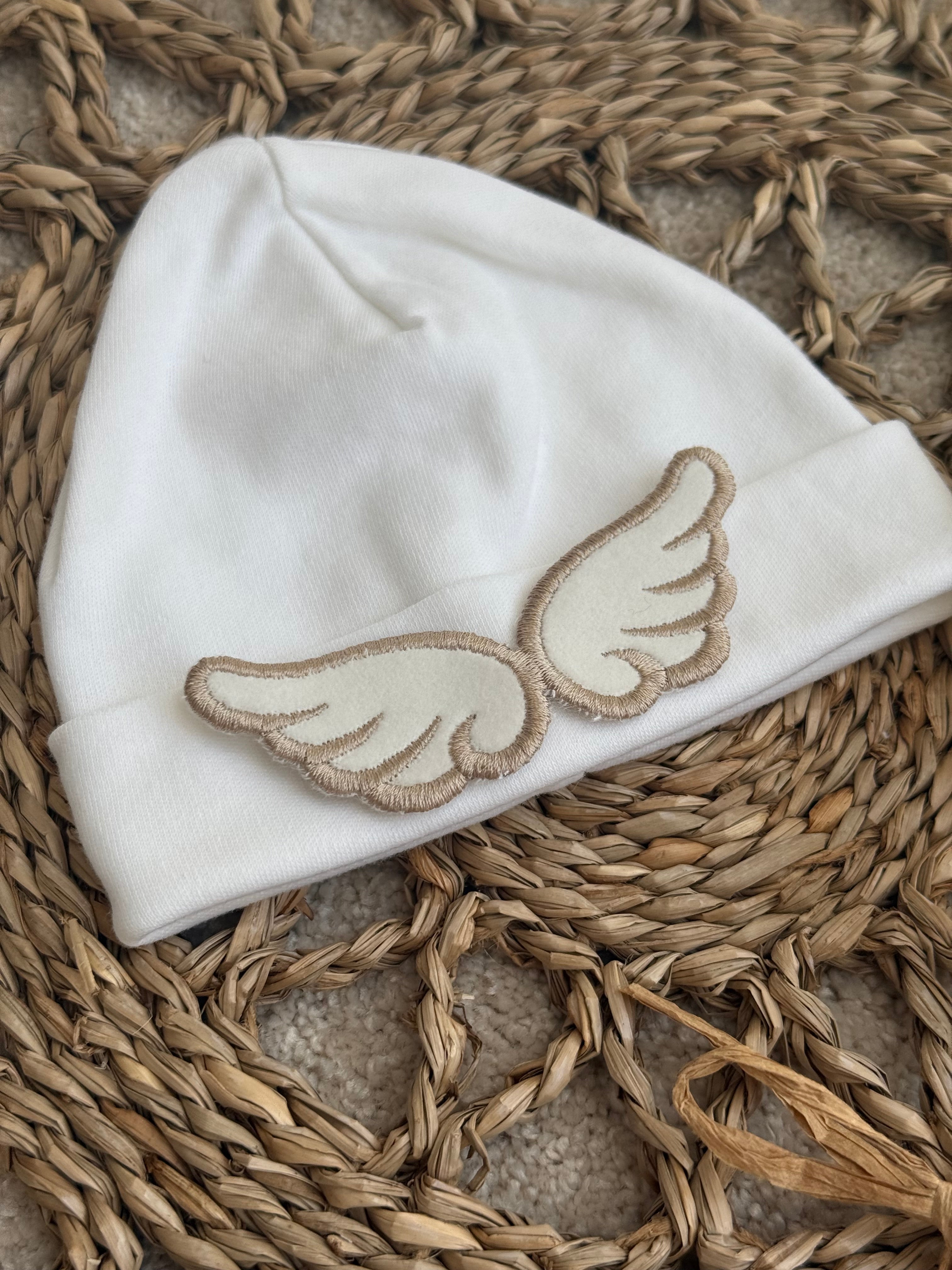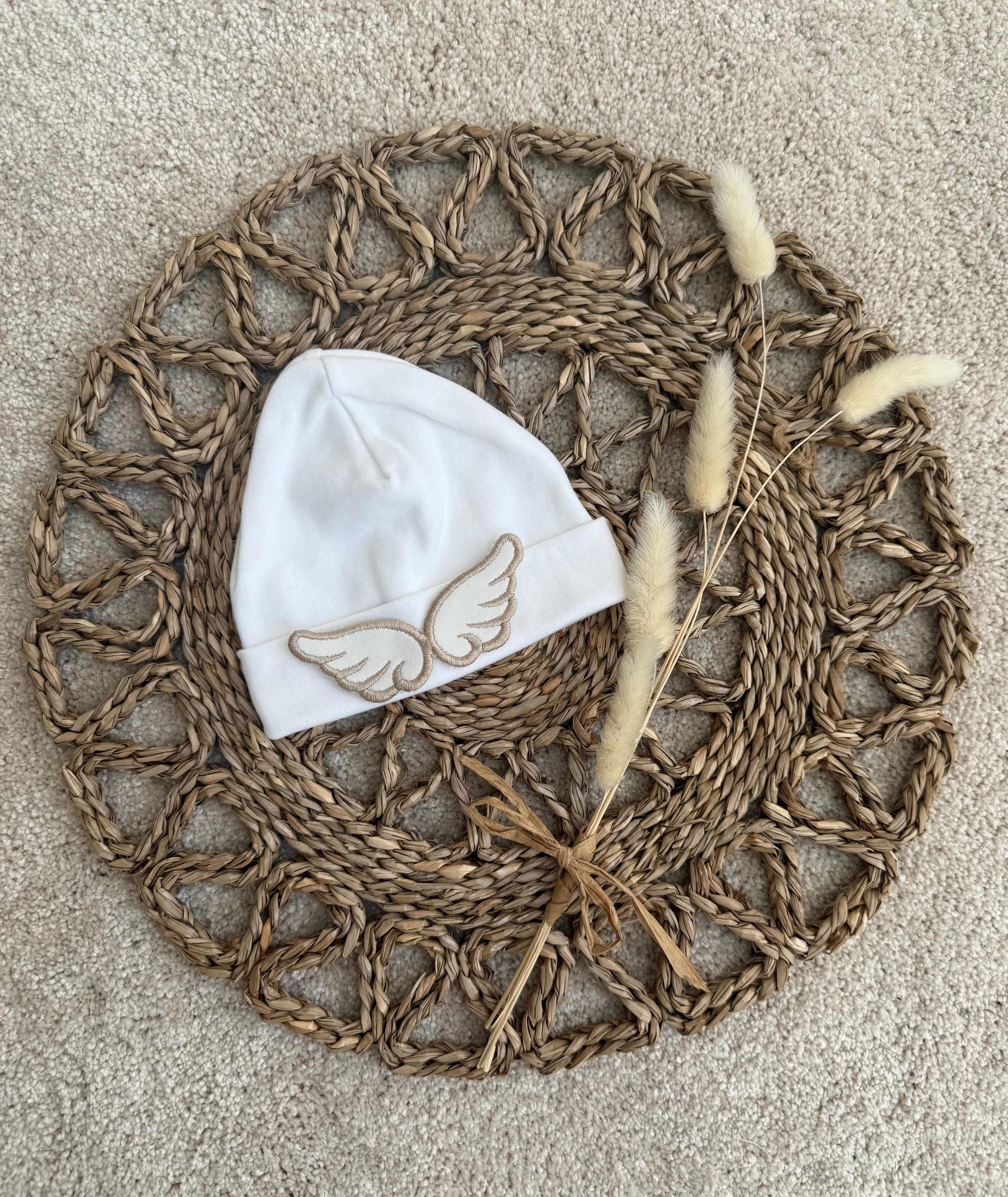 Our stunning little cotton beanie hat is sure a beautiful piece, with angel wings on the front is just amazing and stands out. this is perfect for a coming home hat. will fit up to 1 month.